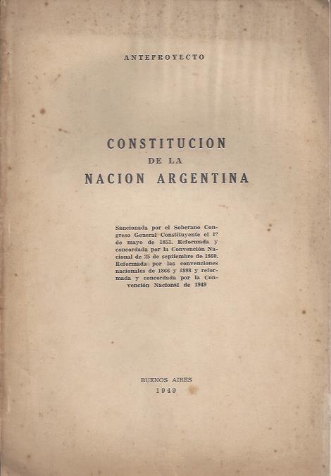 Constitución de la Nación Argentina sancionada por el Soberano Congreso General Constituyente el 1 de mayo de 1853. Reformada y concordada por la Convención Nacional de 25 de septiembre de 1860. Reformada por las Convenciones nacionales de 1866 y 1898 y reformada y concordada por la Convención Nacional de 1949.