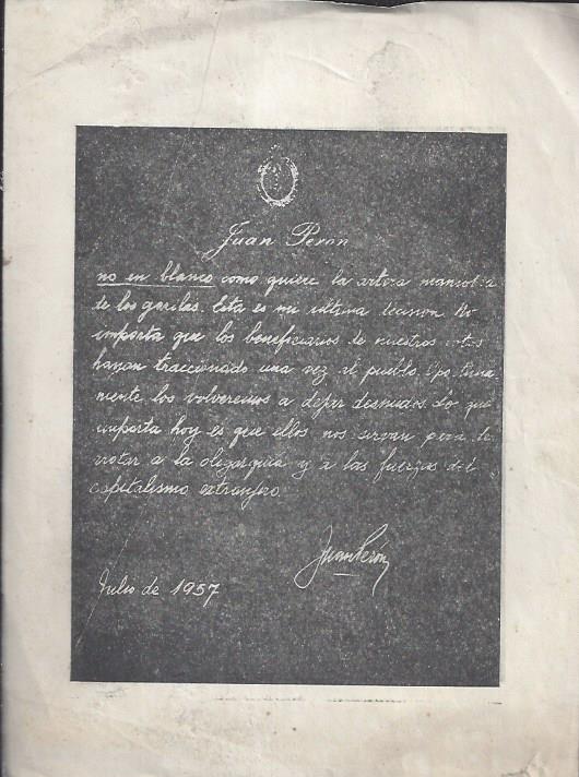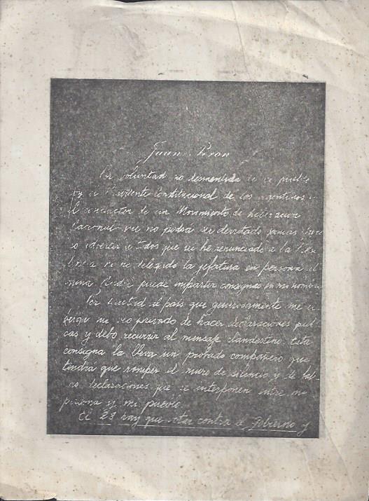 Carta apócrifa de Juan Perón para las elecciones de julio de 1957.