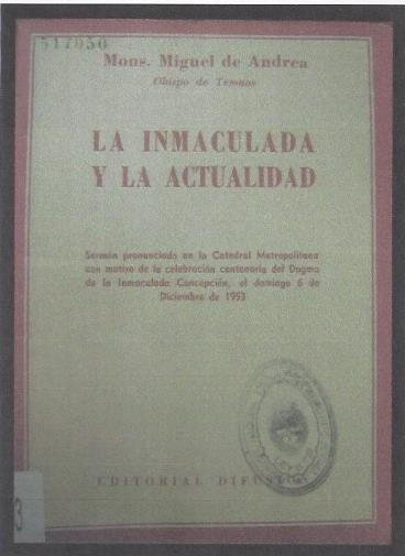 Buenos Aires: Difusión, 1953. Sermón pronunciada en la Catedral Metropolitana con motivo de la celebración centenario del Dogma de la Inmaculada Concepción, el domingo 6 de dicimebre de 1953.