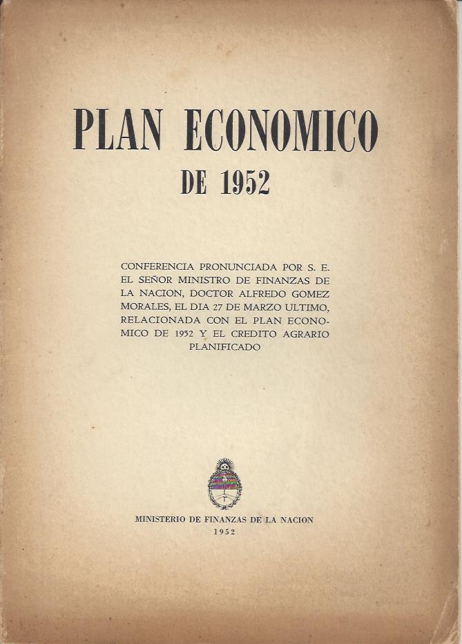 Conferencia pronunciada por S.E. el señor ministro de finanzas de la Nación, Doctor Alfedo Gómez Morales, el día 27 de marzo último, relacionada con el Plan Económico de 1952 y el crédito agrario planificado. Extensión: 19 páginas.