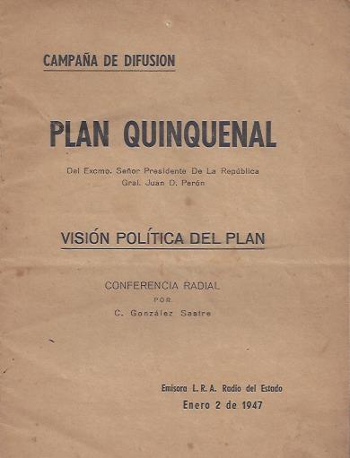 Conferencia Radial sobre Difusión del Plan Quinquenal. Emisora L.R.a. Radio del Estado, 2 de enero de 1947 a las 19:45. Extensión: 16 páginas.