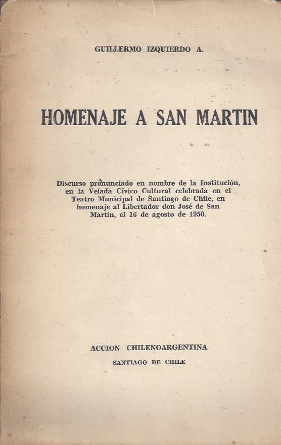 Discurso pronunciado en nombre de la Institución, en la Velada Cívico Cultural celebrada en el Teatro Municipal de Santiago de Chile, en homenaje al Libertador don José de San Martín, el 16 de agosto de 1950.
