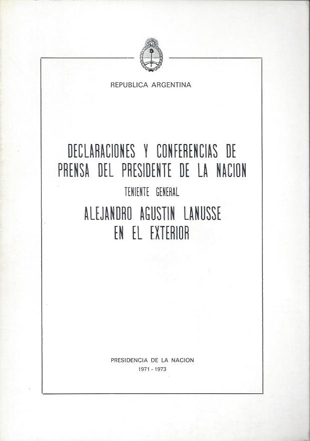 Lanusse, Alejandro. Declracioenes y conferencias de prensa del Presidente de la Nación Teniente General Alejandro A. Lanusse en el exterior.