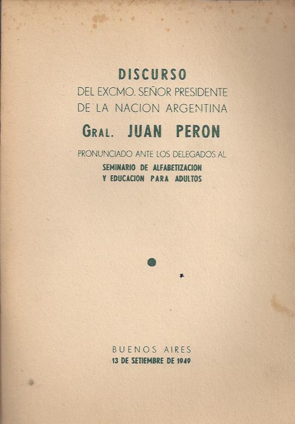 "Ante los delegados del Seminario de Alfabetización y Educación para Adultos, en la Casa de Gobierno, el 13 de septiembre de 1949, el Presidente de la Nación, General Juan Perón, pronunció el discurso que se publica seguidamente".