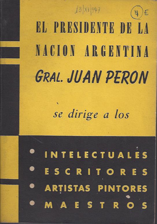El presidente de la Nación Argentina general Juan Perón se dirige A los intelectuales Escritores Artistas Pintores Maestros