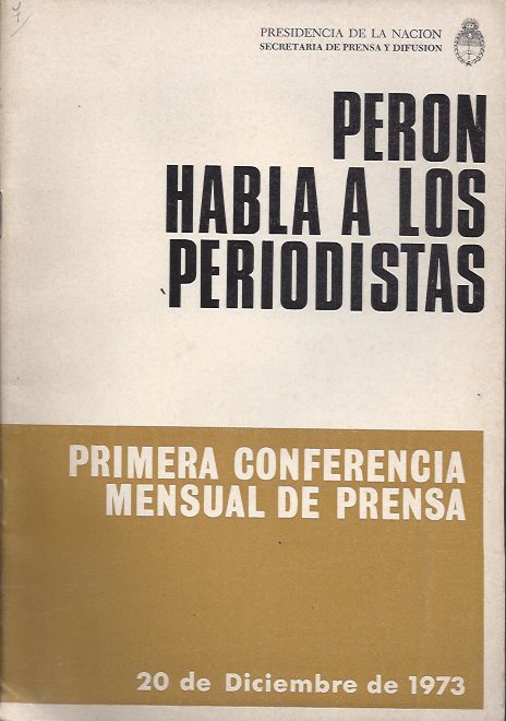 "El 20 de diciembre de 1973 se llevó a cabo la primera conferencia de prensa de las que mensualmente realiza el Teniente General Juan Domingo Perón con los representantes de los medios de comunicación masiva acreditados en la Casa de Gobierno. Dichas reunionesentrañan en nuestro país la adopción de un estilo de información hasta ahora desconocido: el diálogo directo y regular del Primer Magistrado con el periodismo, y fueron dsipuestos a sugerencia de la Secretaría de Prensa y Difusión a fin de mantener permanentemente informado al pueblo sobre la labor que desarrolla el Gobierno de la Nación".