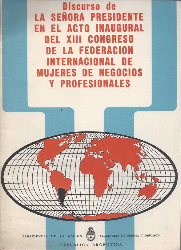 "El 5 de agosto de 1974, la Sra.María E.M.de Perón presidió en el Centro Cultural General San Martín de la Ciudad de Buenos Aires, la sesión inaugural del XIII Congreso de la Federación Internacional de Mujeres de Negocios y Proesionales. Se hallaban presentes además de las representantes de 47 países, la presidente de la Federación, señorita Nezla L.Dane; la titular de la sección argentina, y el secretario privado de la Presidente y ministro de Bienestar Social, señor José López Rega. En la oportunidad, la señora Presidente de la Nación pronunció el siguiente discurso: