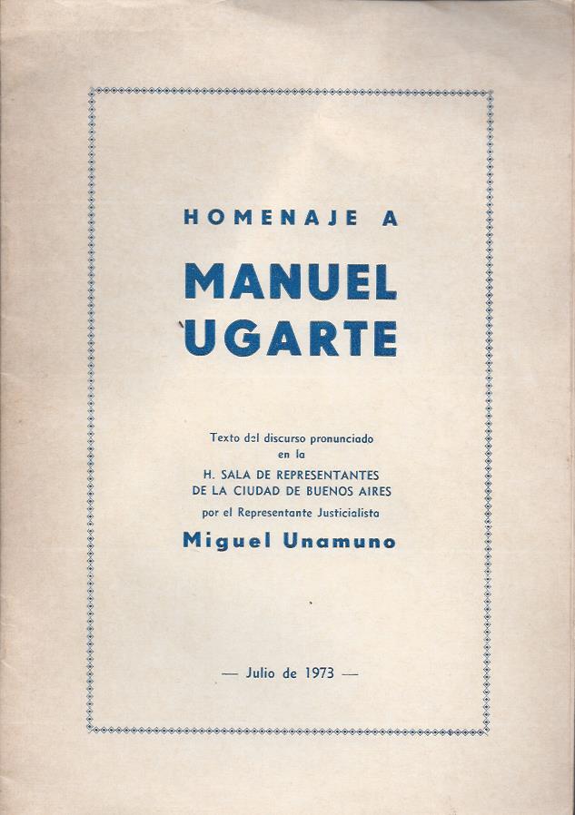 Unamuno, Miguel. Homenaje a Manuel Ugarte. Texto del discurso pronunciado en la H.Sala de Representanes de la Ciudad de Buenos Aires por el representante Justicialista Miguel Unamuno.