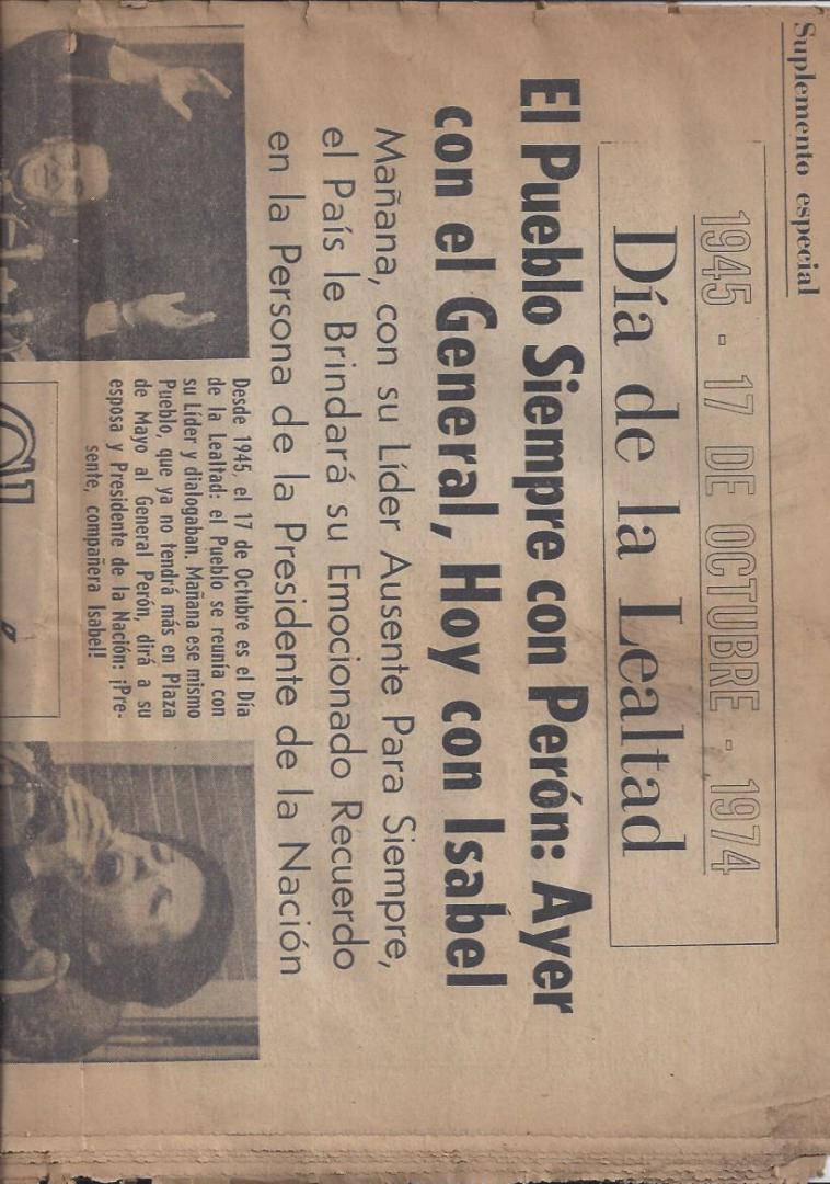 1945-17 de octubre-1974. Día de la Lealtad. El pueblo siempre con Perón: Ayer con el General, hoy con Isabel.
