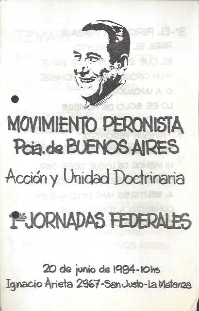 Editado por Mov. Peronista Pcia. Buenos Aires. Buenos Aires-La Matanza, 1984. Convocatoria del Movimiento Peronista Pcia. de Buenos Aires. Acción y Unidad Doctrinaria. 20 de junio de 1984