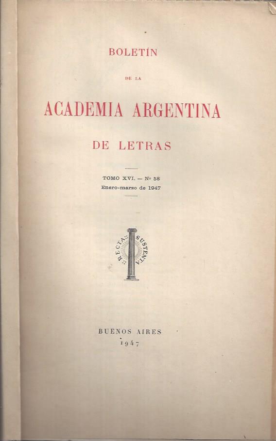 Editado por Academia Argentina de Letras. Buenos Aires, 1947. Tomo XVI. Número 58. enero-marzo 1947.