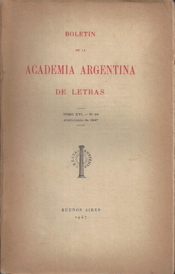 Editado por Academia Argentina de Letras. Buenos Aires, 1947. Tomo XVI. Número 59. Abril-junio de 1947