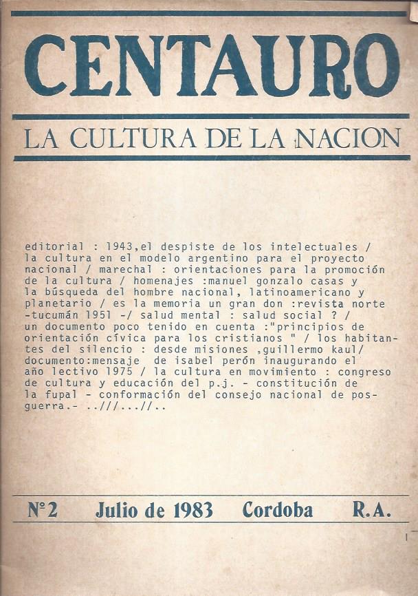Editorial: 1943, el despiste de los intelectuales. La cultura en el modelo argentino para el proyecto nacional. Marechal: orientaciones para la promoción de la cultura. Homenajes: Manuel Gonzalo Casas y la búsqueda del hombre nacional, latinoamericano y planetario. Es la memoria un gran don: revista Norte - Tucumán, 1951. Salud mental: salud social?. Un documentos poco tenido en cuenta. Principios de orientación cívica para los cristianos. Los habitantes del silencio: desde misiones, Guillermo Kaul. Documento: Mensaje de Isabel Perón inauguran el año lectivo 1975. La cultura en movimiento: conctgreso de cultura y educación del P.J. Constitución de la FUPAL. Conformación del Consejo Nacional de Guerra.
