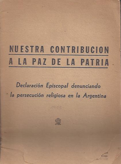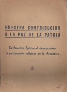Conferencia Episcopal Argentina. Nuestra contribución a la paz de la patria. Declaración Episcopal denunciando la persecución religiosa en la Argentina..
