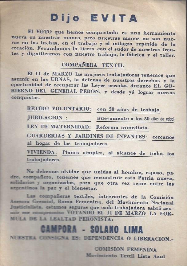 Editado por Comisión Femenina-Movimiento Textil lista azul. Buenos Aires, 1973.