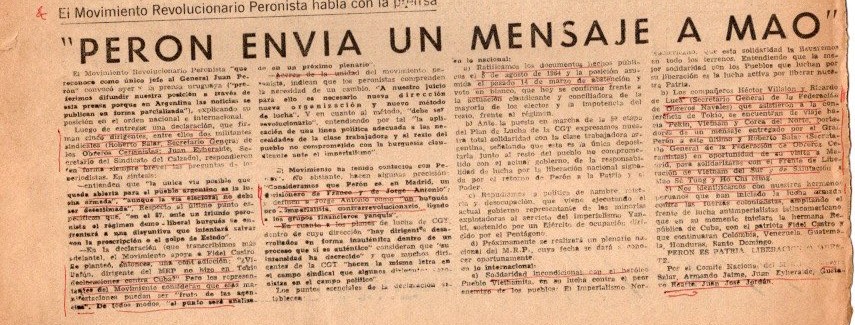 El Movimiento Revolucionario Peronista habla con la prensa: "Perón envìa un mensaje a Mao".