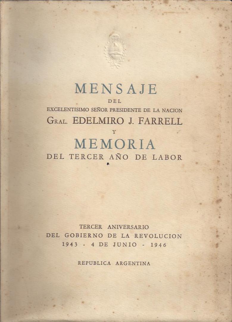 Farrel, Edelmiro J. Mensaje del Excelentísimo Señor Presidente de la Nación Gral.Edelmiro J.Farrell y Memoria del tercer año de labor..