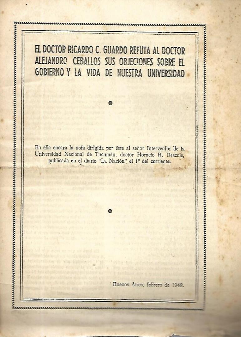 Buenos Aires, 1948. Encara la nota diriigida por el interventor de la Un. Nacional de Tucumán Horacio R. Descole en el Diario La Nación.