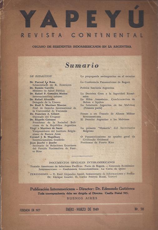 Buenos Aires: Yapeyú, 1949. YAPEYU. Revista continental. Organo de residentes indoamericanos en la Argentina.