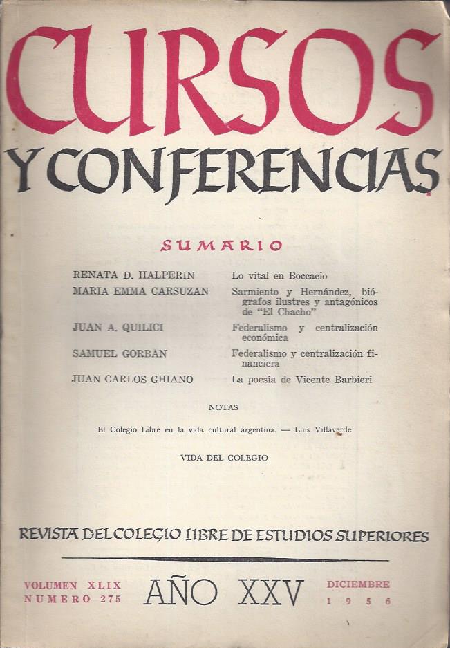 Buenos Aires, 1956. N° 275. Revista del Colegio Libre de Estudios Superiores. Diciembre 1956. Incluye trabajos de Halperin R.; Carsuzan, M.E.; Quilici, Gorban, Ghiano.