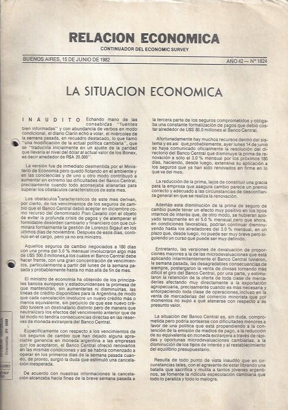 Editado por Relacion Económica. Buenos Aires, 1982. Relación económica (continuador del economic survey). Número 1824