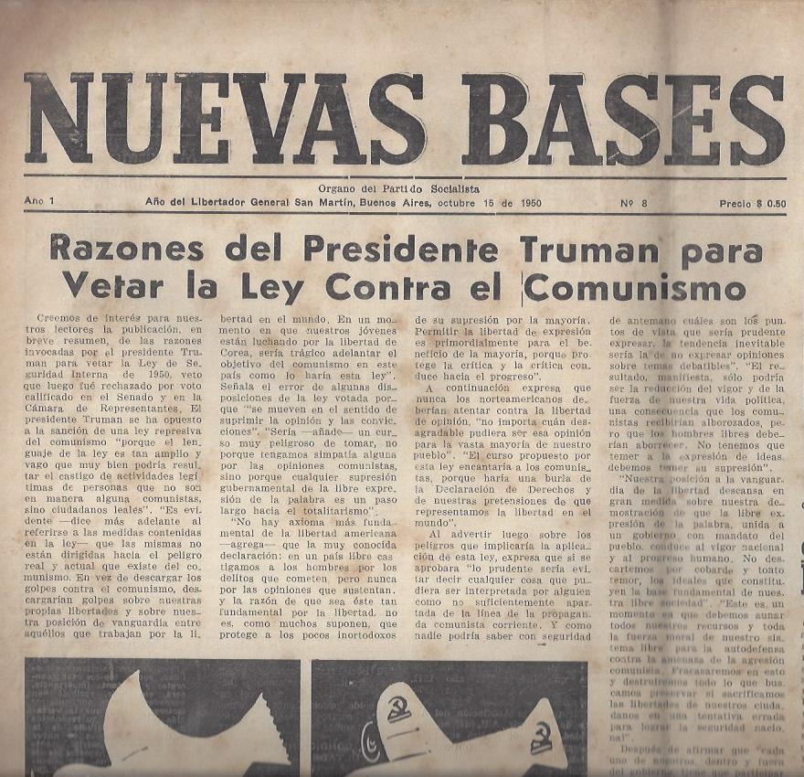 Editado por Partido Socialista. Buenos Aires, 1950. Organo del Partido Socialista. Número 8. 15 de octubre de 1950.