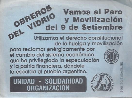 Editado por Sindicato obreros de la industria del vidrio. Buenos Aires, 1988. septiembre de 1988