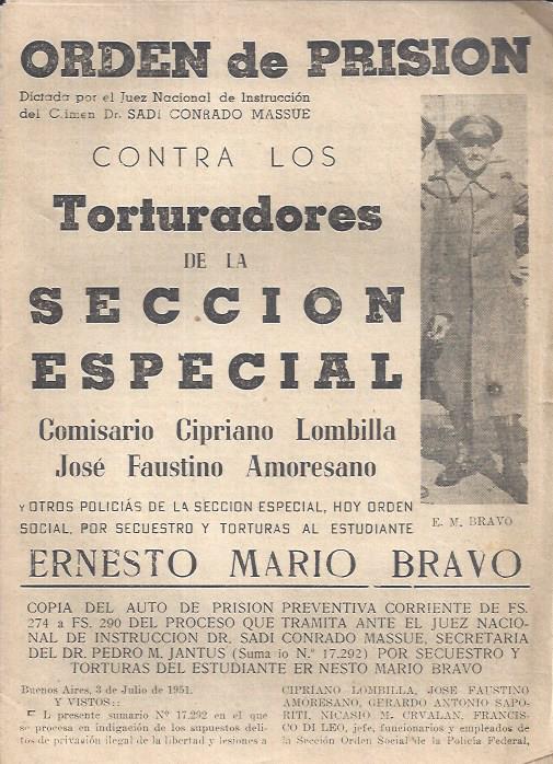 Orden de prisión contra los torturadores de la sección especial, Comisario Cipriano Lombilla y José Faustino Amoresano por secuestro y torturas al estudiante Ernesto Mario Bravo.