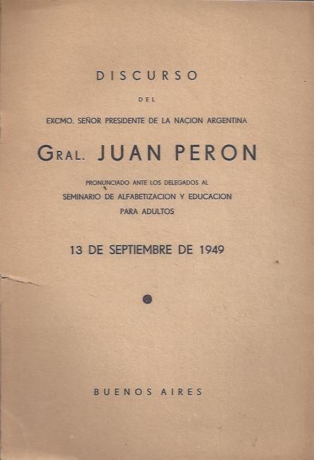 Perón, Juan D. Discurso del Excmo.Sr.Presidente de la Nación Argentina Gral.Juan Perón pronunciado ante los delegados al Seminario de Alfabetización y educación para adultos.