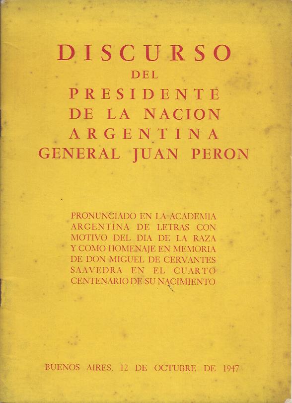 Perón, Juan D. Discurso del Presidente de la Nación Gral Juan Perón en la Academia de Letras con motivo del Día de la Raza y como homenaje en memoria de Don Miguel de Cervantes Saavedra en el cuarto centenario de su nacimiento.