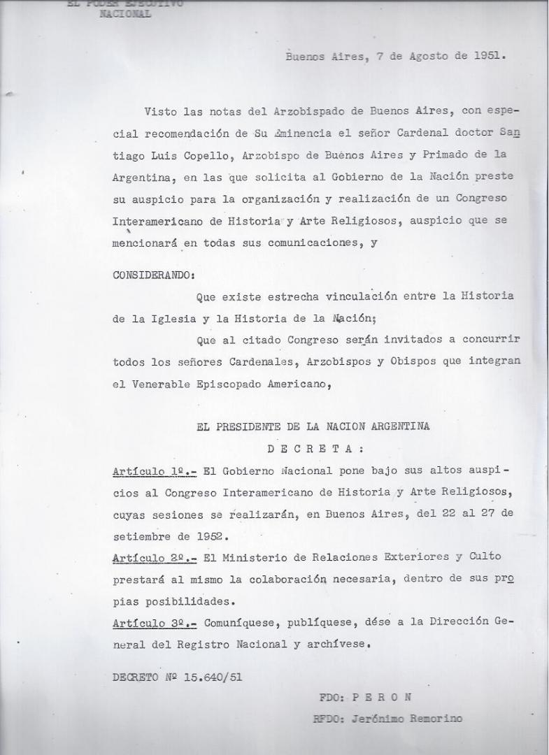 Perón, Juan D. Documento del P.E.N. auspiciando Congreso Interamericano de Historia y Arte religiosos.