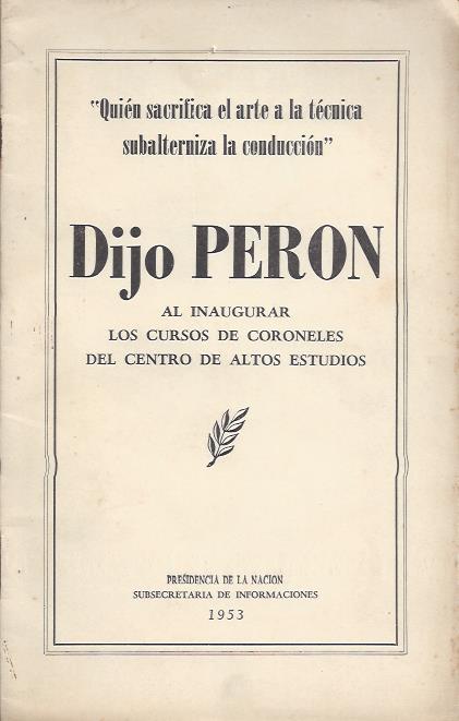 Buenos Aires: Subsecretaría de Informaciones de la Presidencia de la Nación, 1953. Discurso al inaugurar los cursos de coroneles del Centro de Altos Estudios