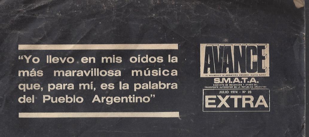 Editado por Avance. Buenos Aires, 1974. Revista Avance-SMATA- Extra. Número 28. julio 1974