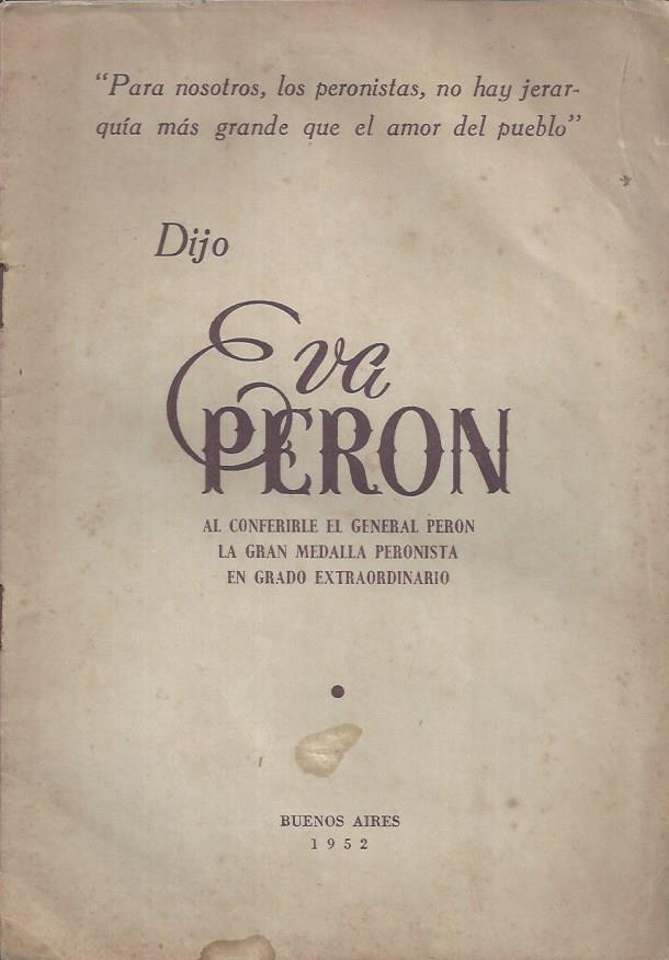 Perón, Eva. Dijo Eva Perón al conferirle el General Perón la gran medalla peronista en grado extraordinario.