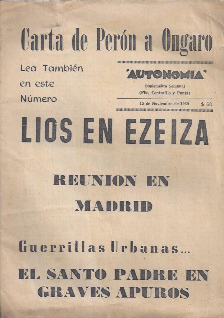 Buenos Aires, 1969. Revista Autonomía. Suplmemento semanal (Filo, contrafilo y punta). 15 de noviembre de 1969.