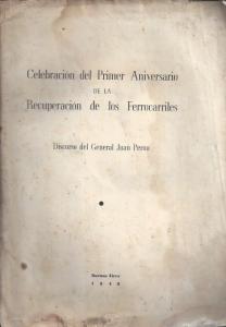 Perón, Juan D. Celebración del primer aniversario de la recuperación de los ferrocarriles. Discurso del general Juan Perón.