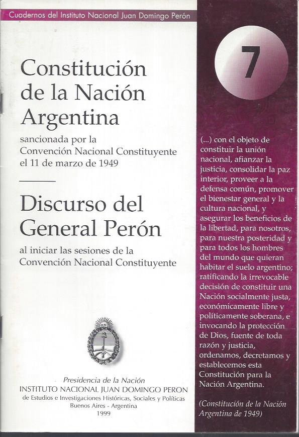 Buenos Aires: Instituto Nacional Juan Domingo Perón, 1999. Discurso del General Perón al iniciar las sesiones de la Convención Nacional Constituyente