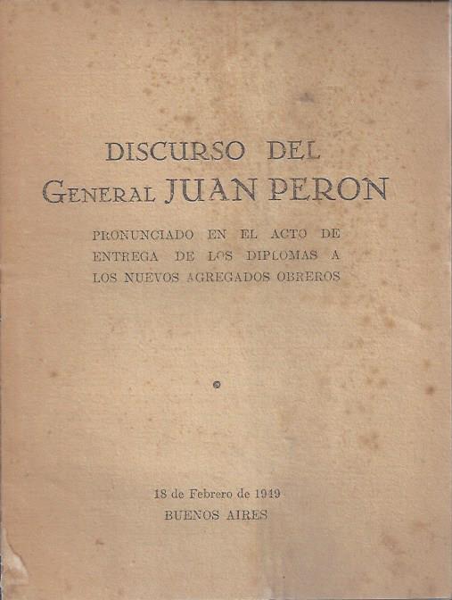 Perón, Juan D. Discurso del General J.D.Perón pronunciado en el acto de entrega de los diplomas a los nuevos agregados obreros.