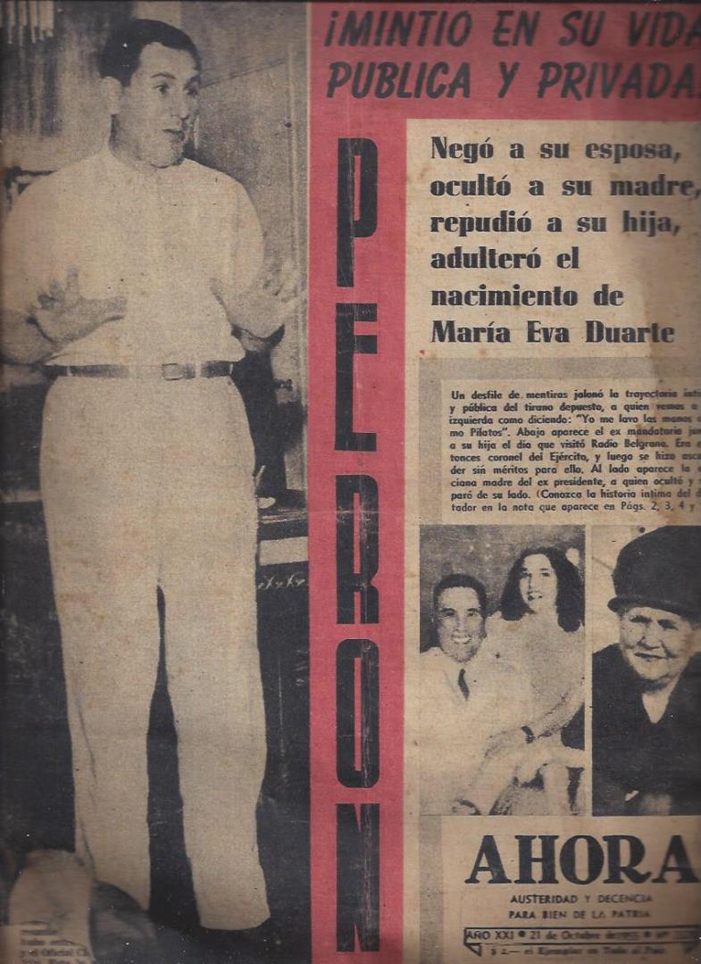 Perón. ¡Mintió en su vida pública y privada! Negó a su esposa, ocultó a su madre, repudió a su hija, adulteró el nacimiento de María Eva Duarte.