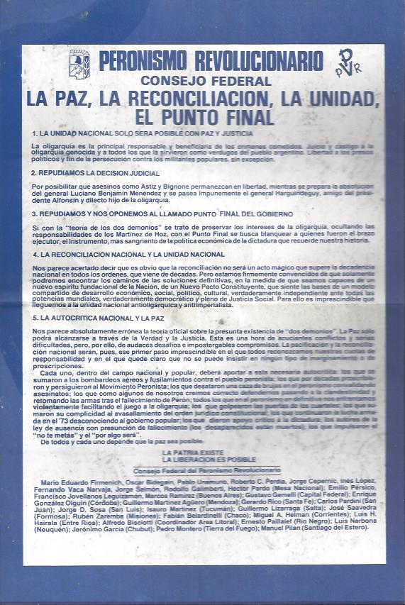 Peronismo Revolucionario-Consejo Federal. La paz, la reconciliación, la unidad, el punto final.