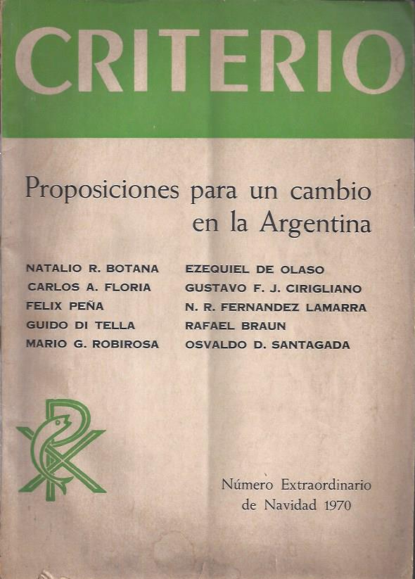 Editado por Criterio. Buenos Aires, 1970. Revista Criterio. Número 1609/1610. Diciembre 1970. Incluye colaboraciones de Botana, Floria, Peña, G.Di Tella, Robirosa, Olaso, Cirigliano, Fernández Lamarra, Braun y Santagada.