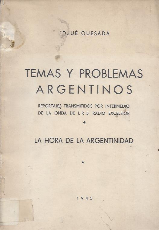 Quesada, Josué. Temas y problemas argentinos. Reportajes transmitidos por intermedio de la onda de LR 5, Radio Excelsior. La hora de la argentinidad.
