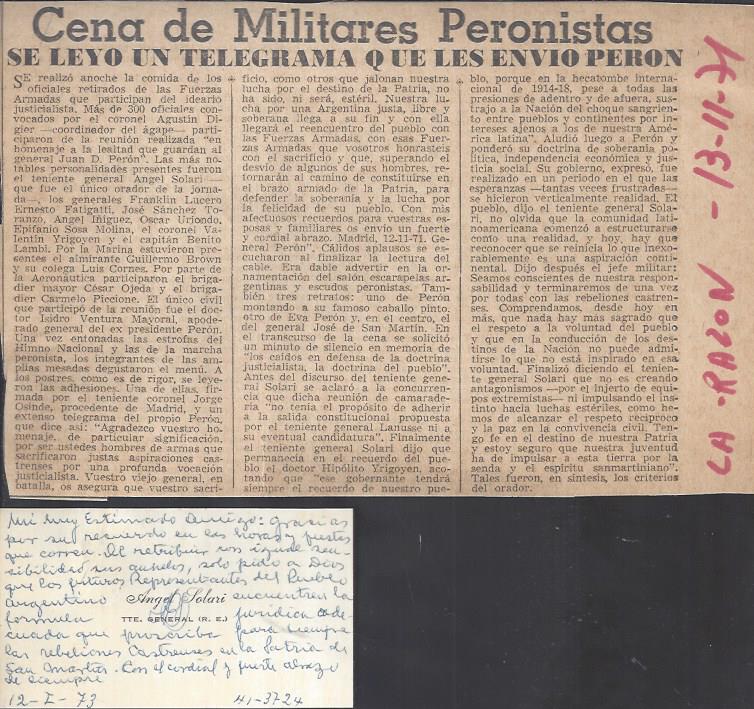 Buenos Aires, 1971. 12 de noviembre de 1971. Acompañado de recorte de prensa de La Razón del 13-11-71 y tarjeta manuscrita del Tte. Gral. Solari.