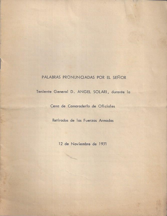 Solari, Angel. Palabras pronunciadas por el señor Tte. Gral. D. Angel Solari, durante la Cena de Camaradería de Oficiales Retirados de las Fuerzas Armadas.