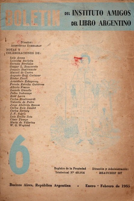 Buenos Aires, 1955. Nº6. Enero-febrero de 1955. Incluye trabajos de Arena, Barletta, Berdiales, Benavente, Castro, A.R. Cortazar, Eandi, Echegaray, Estrella Gutiérrez, Franco, Gianello, Inchauspe, Larra, Mastronardi, de Pedro, J.A.Ramos, Daudet, Serfaty, Soleto, Soto, Tiempo, Villarino, Weyland