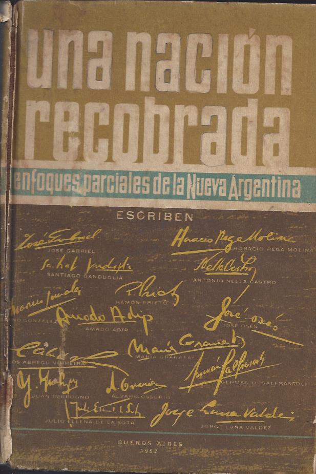 Editado por Subsecretaría de Informaciones. Buenos Aires: Subsecretaría de Informaciones de la Presidencia de la Nación, 1952. Escriben: Juan Imbrogno; Alvaro Ossorio; Ramón Prieto; Marino González; Germán O. Galfrascoli; Santiago Ganduglia; Julia Ellena de la Sota Jorge Luna Valdez, José Osés, José Gabriel , Antonio Nella Castro , Carlos Abregú Virreira, Amado Adip, Horacio Rega Molina, María Granata.